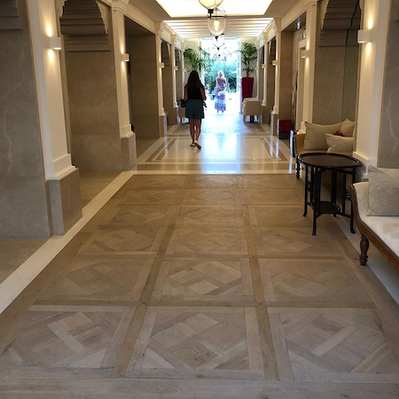 Ik doel in dit geval op het decoreren van een vloer. Het aanbrengen van een band om een visgraat gelegde vloer is zeer decoratief en geeft een nieuwe dimensie aan de interactie tussen de vloer en de muur. Door de onderbreking die de band veroorzaakt, wordt de overgang naar de plint en de muur versterkt en krijgen beiden extra aandacht in onze hersenen, waardoor er een rustigere uitstraling vanuit gaat.